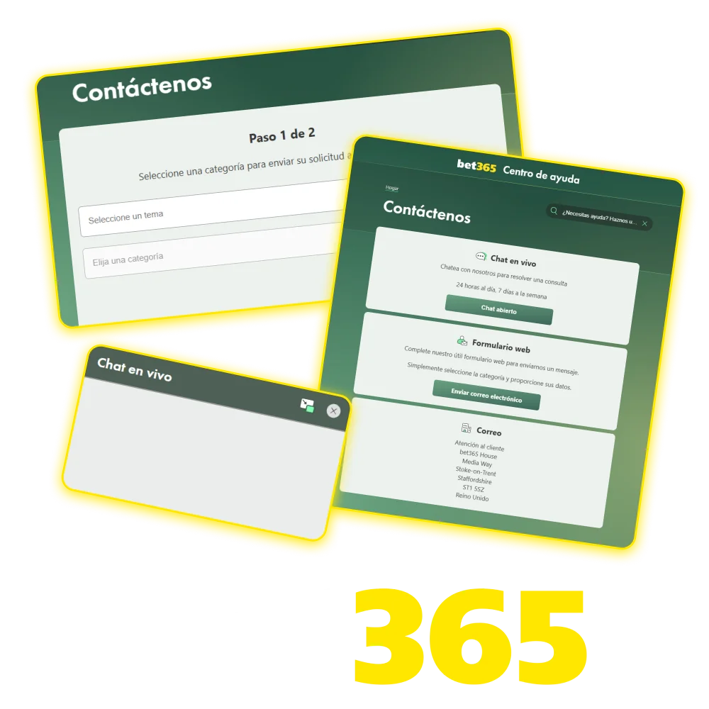 En esta página encontrarás todas las formas de ponerte en contacto con el equipo de Bet365. Puedes comunicarte mediante correo electrónico, chat en vivo, teléfono, mensajería instantánea y redes sociales en español. El tiempo promedio de respuesta es de 24 horas por e-mail y minutos por chat.
